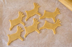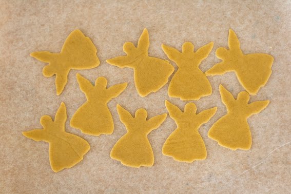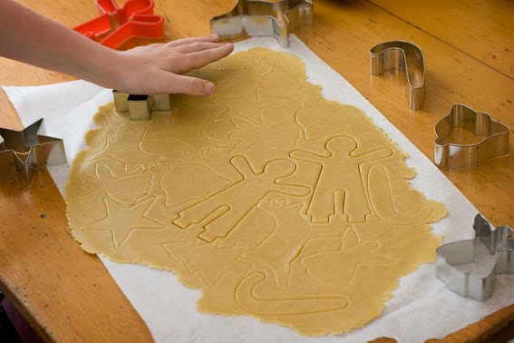 Roll dough out evenly to 3mm thickness between sheets of baking paper, cut into shapes.