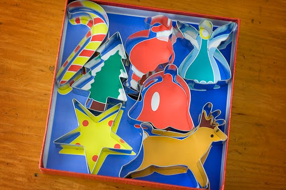 So now I have added to my dwindling collection of odd hearts and stars, gingerbread man, woman and child (how PC is that!), butterfly, teddy bear, and other non- descript cookie cutters, and now I have a shiny new star, candy cane, bell, tree, an angel and a reindeer!