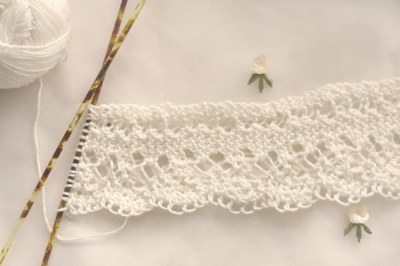 Vogue knitters might recognise this lace pattern – it is actually the hem of #11 Lace Tank by Nancy Cassels, from their S/S 2007 issue.  However that isn’t what I’m knitting – even though that is actually in my queue!  This is the first time I’ve knitted lace with yarnovers and decreases in every row – just as well each row only has a few stitches!  For the record I am using 3mm needles to get a finer lace.