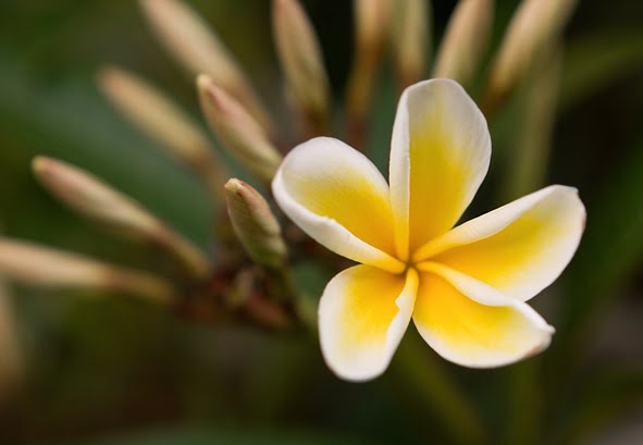 About three months ago DH arrived home with a rather dead looking branch and lovingly planted it in a large pot. When I asked what it was, and what it was doing on our property, he said it was actually a tropical frangipani and that with some TLC it might survive. It looked pretty dead to me.