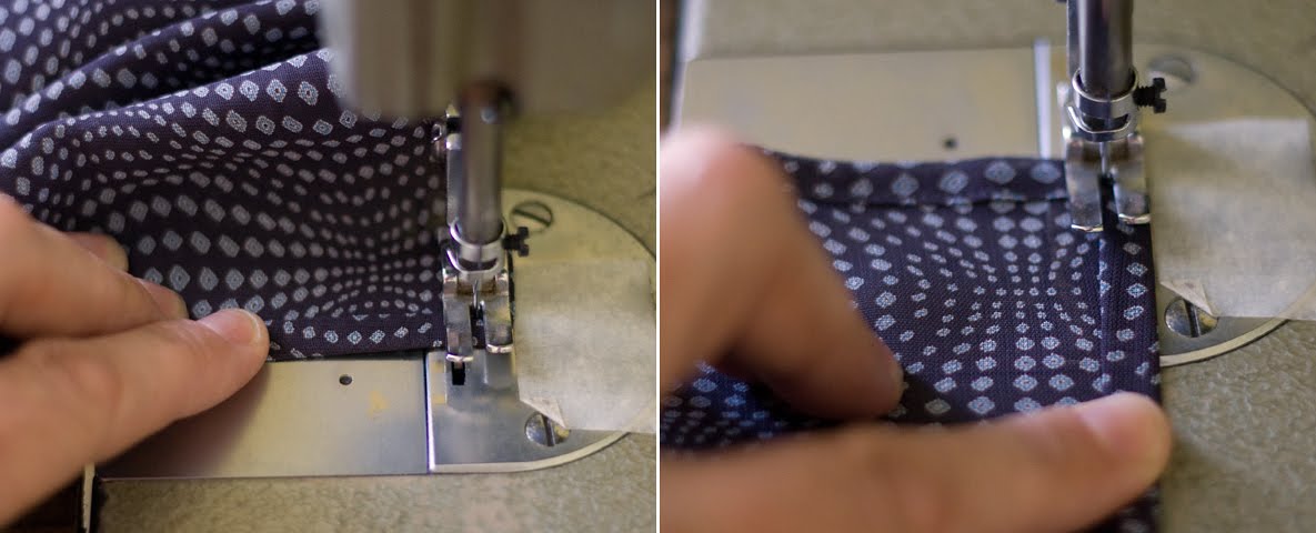 • You will have stitched through four layers of the hem allowance.  To reduce bulk in the corner, trim the excess seam allowance away diagonally, to within 1-2mm of your stitching: