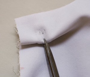 Placement of the opening on the front facing may differ to the placement of the buttonhole on the front, due to turn of cloth. Once the front facing is attached, buttonhole positioning can be offset 3-6mm, so I determine the exact placement once the front facing is on. To do this, place pins through the corners of the buttonhole to mark its exact position on the facing. Mark 3mm in from the ends with dots.