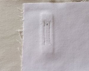 Cut rectangles of silk organza about the same size as the buttonhole welts, and using your dots as a guide, sew them to the right side of the front facing in a rectangle the same size as your finished buttonhole: