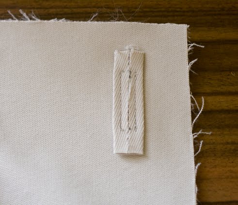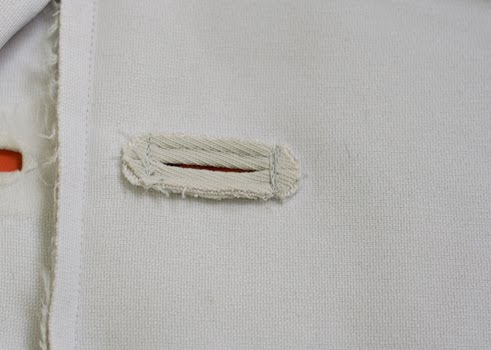 Cut rectangles of silk organza about the same size as the buttonhole welts, and using your dots as a guide, sew them to the right side of the front facing in a rectangle the same size as your finished buttonhole: