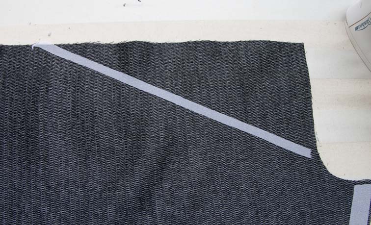 If your fabric has seam slippage or frays easily, eg a loosely woven tweed, then you will need to fusetape all seams that are not yet fused.  Seams are fusetaped before sewing.  I lay my cut panel on my pattern piece to ensure they are exactly the same shape and length, then apply the fusetape to the wrong side stitching line, extending it about 1cm into body panel and 5mm into seam allowance.  When you sew the seam, you will sew through the tape on each side as well.  Fusetape any back darts in the same manner – cut a piece of fusing the same shape as your dart intake plus 1cm all around, press it on and sew the dart through all thicknesses.
