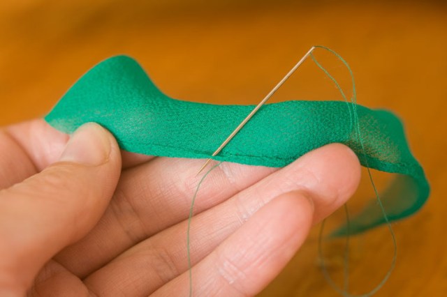 I found it easiest to hold the edge like so – with my thumb folding the edge of the chiffon over slightly, and my outer fingers holding the other end with a slight tension: