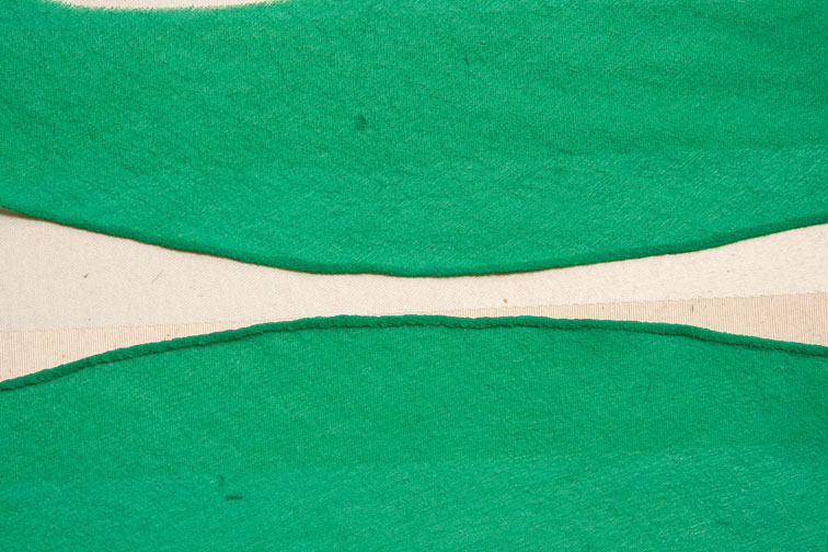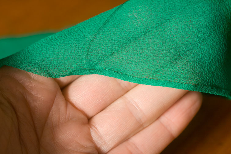 There are lots of options for finishing the free edge of a flounce, but not all of them I like.  Sometimes the inside needs to look as neat as the outside.  For my current project, OK – one of my current projects, the one in emerald silk georgette, I’m getting all couture-y and sewing a hand rolled hem.  I like the finished effect which is invisible from the right side, and and visible only as a fine edge on the reverse: