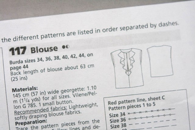 You can leave the hem rolled or press it flat- and I’m not sure which way is ‘correct”.  Rolled it gives a bit of body, but I pressed mine flat as I found the edge of the georgette draped better.  It is going to be the edge of the flounce on this top from Burda August 2009 so it needs to drape symmetrically, hopefully: