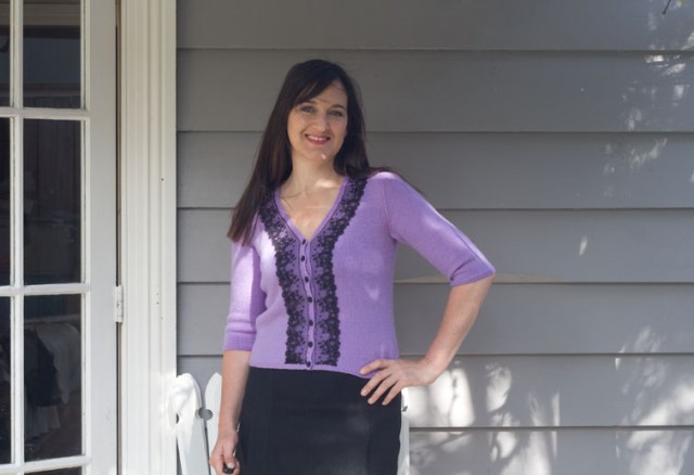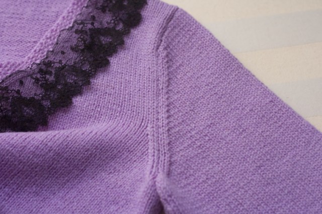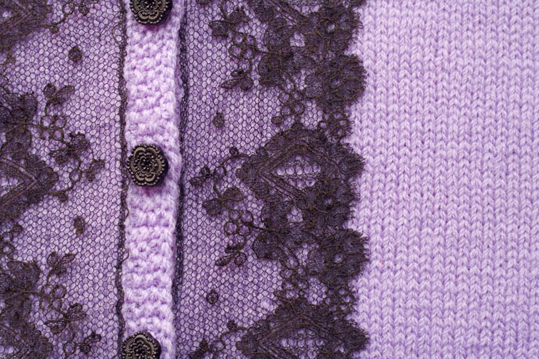 If you are a regular reader of this blog you might recognise this item already, you may even have helped me to choose the colour of the buttons – if so, thank you for your input! I started knitting it about a year ago, and finally have all the ends woven in, and attached the lace, and sewn on the black-rather-than-lilac buttons.