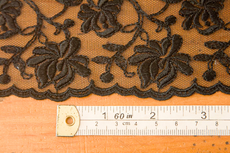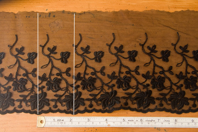 This depends entirely on the pattern repeat of your lace. Study the design and you will notice that the pattern repeats at regular intervals – I’ve marked one pattern repeat on this black net so you can see what I mean: