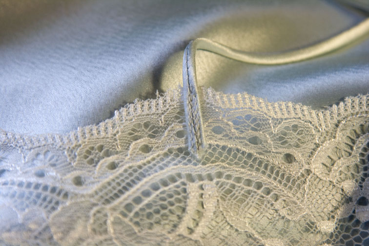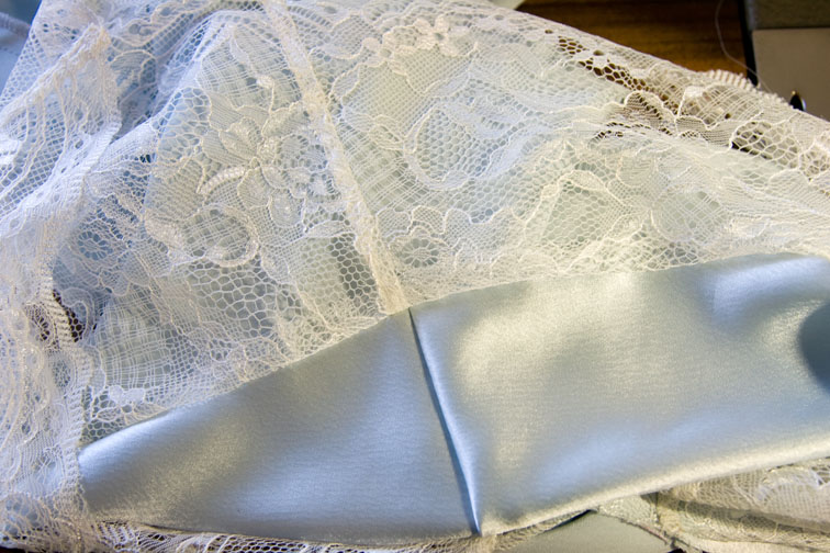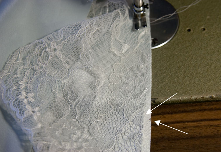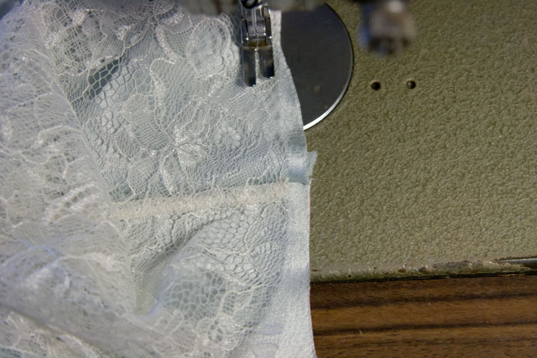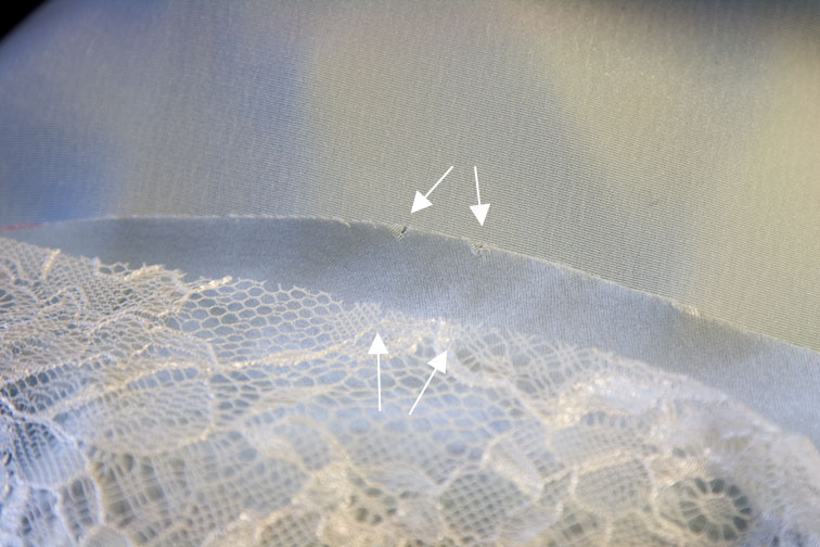 Then start sewing with the lace on top and satin on the bottom.  The satin will feel slightly larger than the lace but it isn’t – this is the cut edge of the satin spreading out because it is on the bias.  Slip your L hand between the layers and adjust the satin so it lies flat, even, and the notches match: