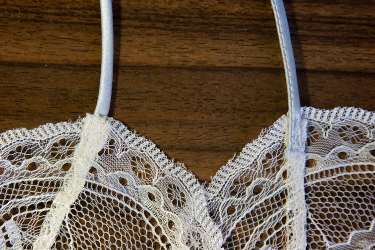 Sew the strap to the lace as before, I trimmed the end to a point so it looked neat: