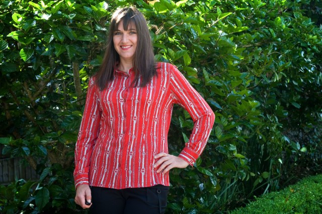 what a great find, a knit shirt. I never see those in the stores anymore. Love the print/color, you look great in red.