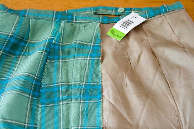 Looking closer, it has been taken in even further on one side.  Whoever made the alteration removed half of the waistband, took in the R side seam, and sewed the waistband back together again – all to avoid interfering with the zip.  This means the darts and tartan are both off-centre, something that Needs To Be Changed!
