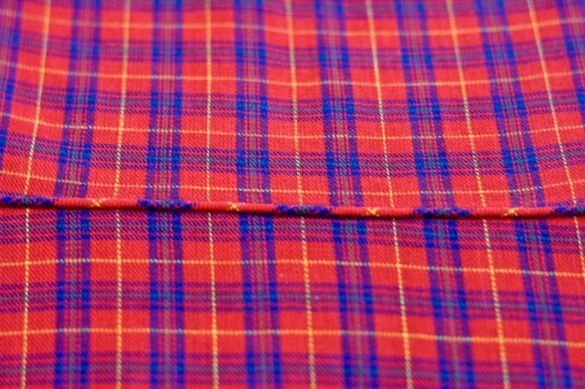 I cut this out, then remembered I was using a checked fabric! Most checks aren’t true squares but are rectangular instead, so you need to cut slightly off the true bias to pass through the same part of the check pattern. I recut the strip at the same angle as the line in the left corner – thank goodness I had enough fabric!
