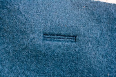 This fabric is really thick! I was a bit worried about the bound buttonholes, so did a bit of research. In the Reader’s Digest Complete Book of Sewing the “two-piece piped method” is recommended for thick fabrics. That’s the one where you make an organza window and sew the welts in behind, so that’s what I did.