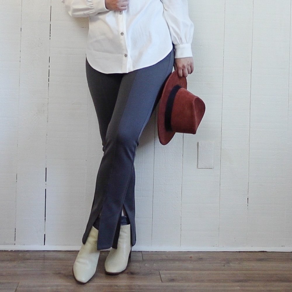 Sachi from @sachidonguri sewed her pair in charcoal ponti, and widened the lower leg for more of a trouser look – I really love this idea! You can find more about exactly what she did on her YouTube channel Sachi’s Studio, where she documents all her adjustments, and so much more on the making of her Linear Leggings – it’s really worth checking out!